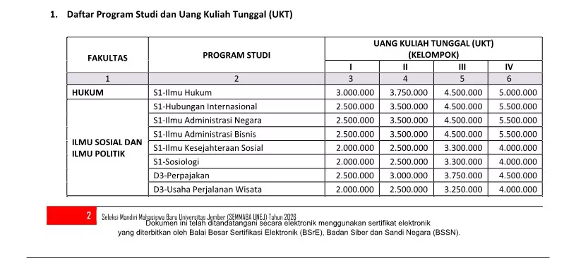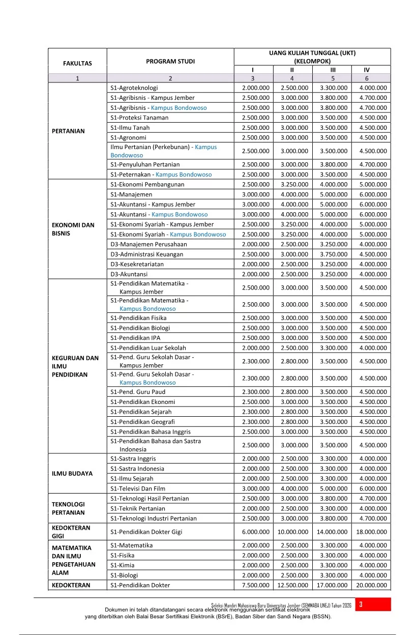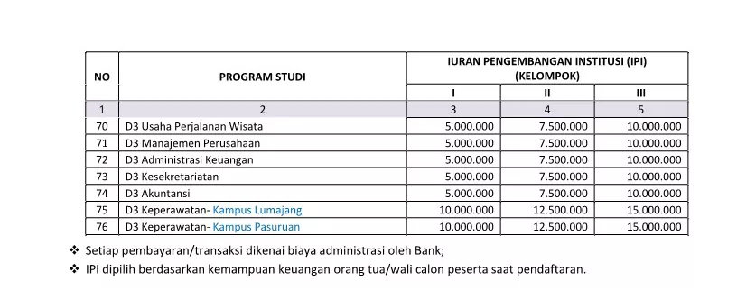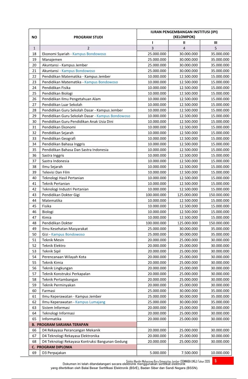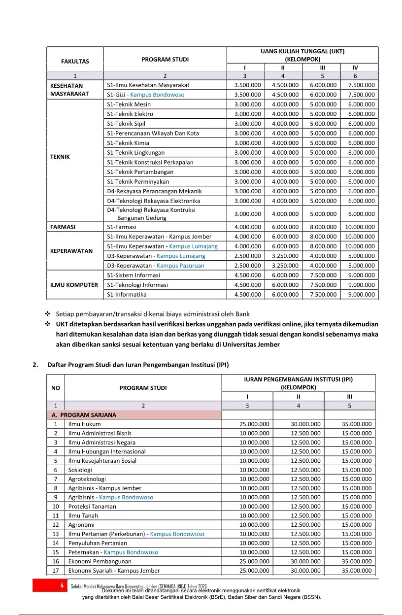 Biaya Pendidikan Jalur Seleksi Mandiri Mahasiswa Baru Universitas Jember Program Diploma, Program Sarjana Terapan, dan Program Sarjana Universitas Jember terdiri dari Uang Kuliah Tunggal (UKT) yang dibayar setiap semester terdiri dari 4 (empat) kelompok dan Iuran Pengembangan Institusi (IPI) yang dibayarkan diawal semester sebelum masa registrasi terdiri dari 3 (tiga) kelompok.