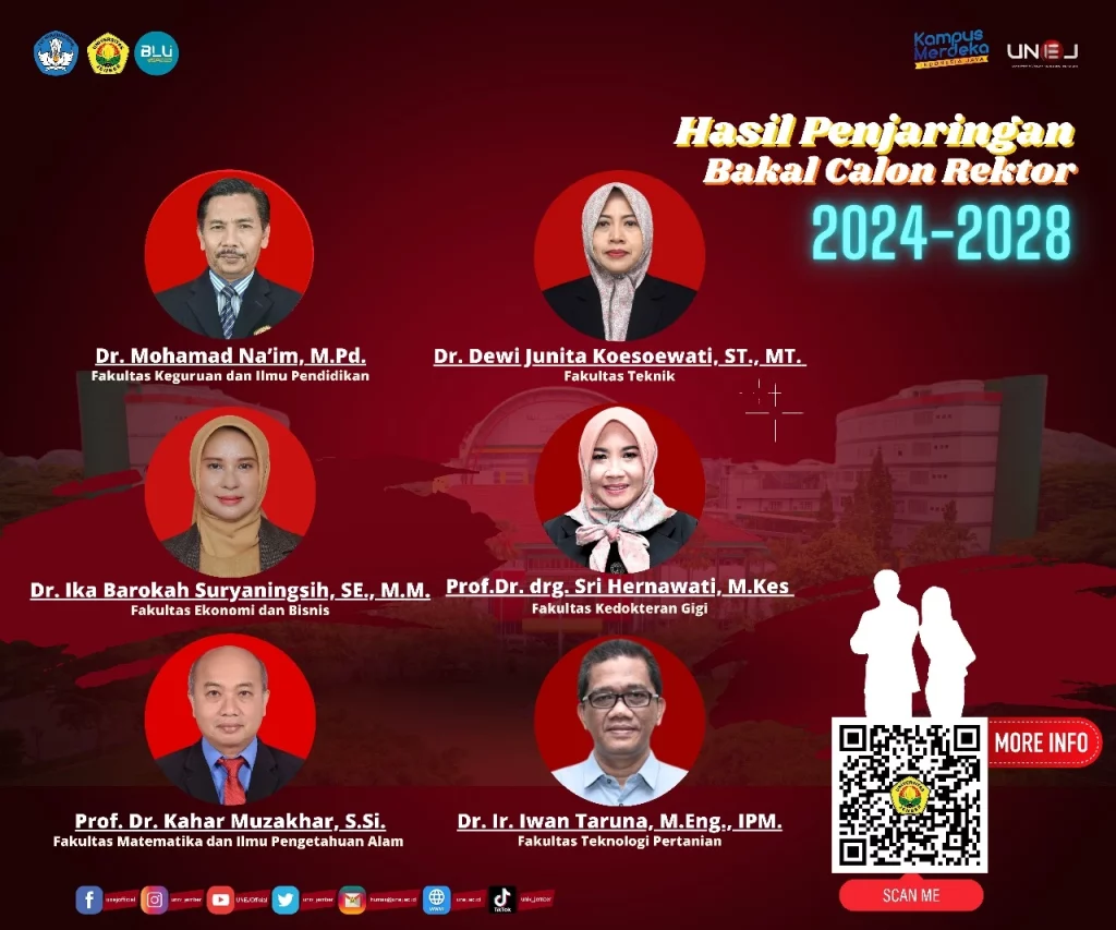 Mereka adalah Dr. Mohamad Naβim, M.Pd., dari Fakultas Keguruan dan Ilmu Pendidikan. Dr. Ika Barokah Suryaningsih, S.E., M.M., dari Fakultas Ekonomi dan Bisnis. Prof. Dr. Kahar Muzakhar, S.Si., dari Fakultas Matematika dan Ilmu Pengetahuan Alam. Dr. Dewi Junita Koesoemawati, S.T., M.T., dari Fakultas Teknik. Prof. Dr. drg. Sri Hernawati., M.Kes., dari Fakultas Kedokteran Gigi, dan Dr. Ir. Iwan Taruna, M.Eng., IPM., dari Fakultas Teknologi Pertanian.