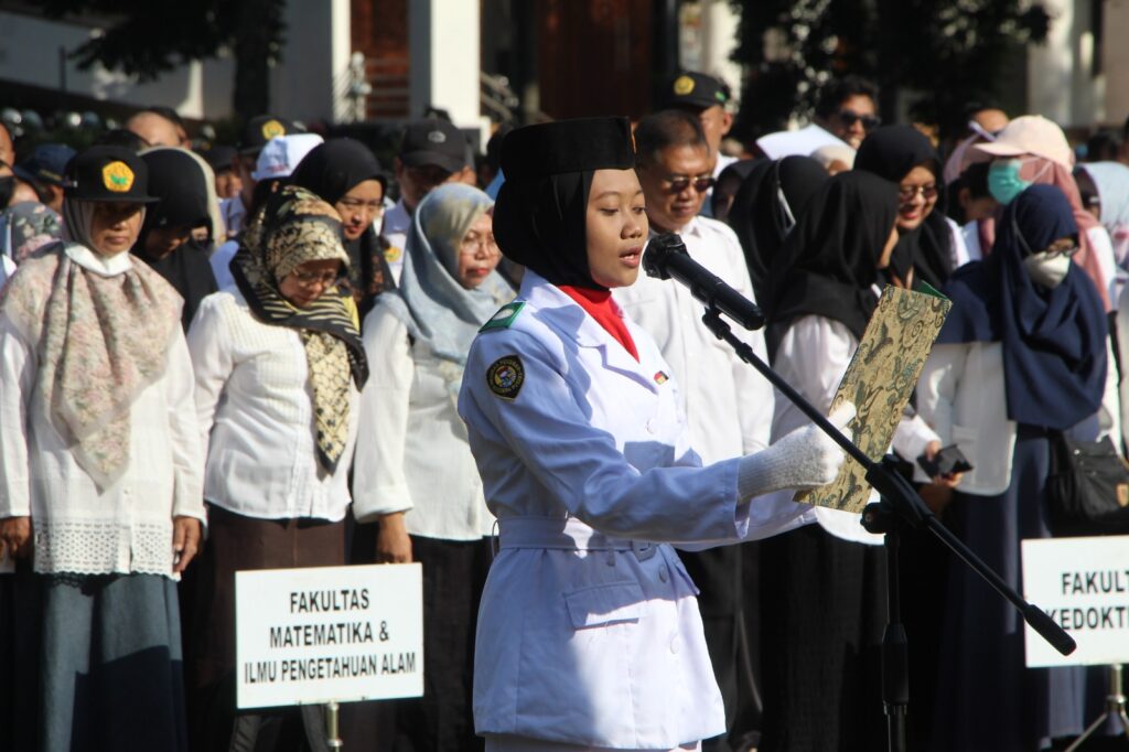 Dalam upacara yang berlangsung khidmat tersebut, Ketua Senat UNEJ, Drs. Andang Subaharianto, M.Hum., membacakan ikrar yang meneguhkan semangat civitas akademika untuk tetap menjadikan Pancasila sebagai landasan kehidupan berbangsa dan bernegara.