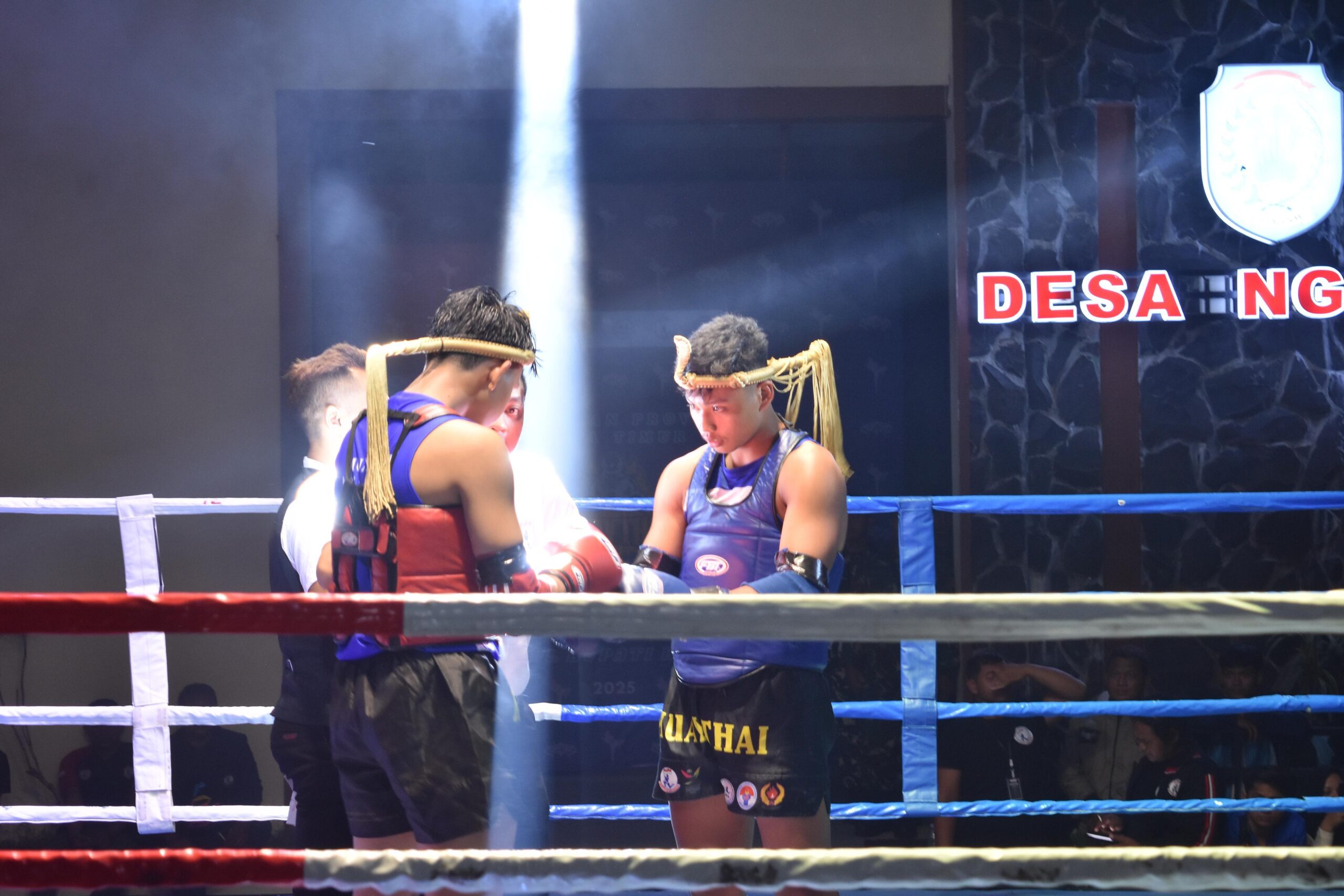 Muchammad Nizam Zakariya (vest merah), dalam pertandingan final Kejurprov Muaythai 2025 di Blitar