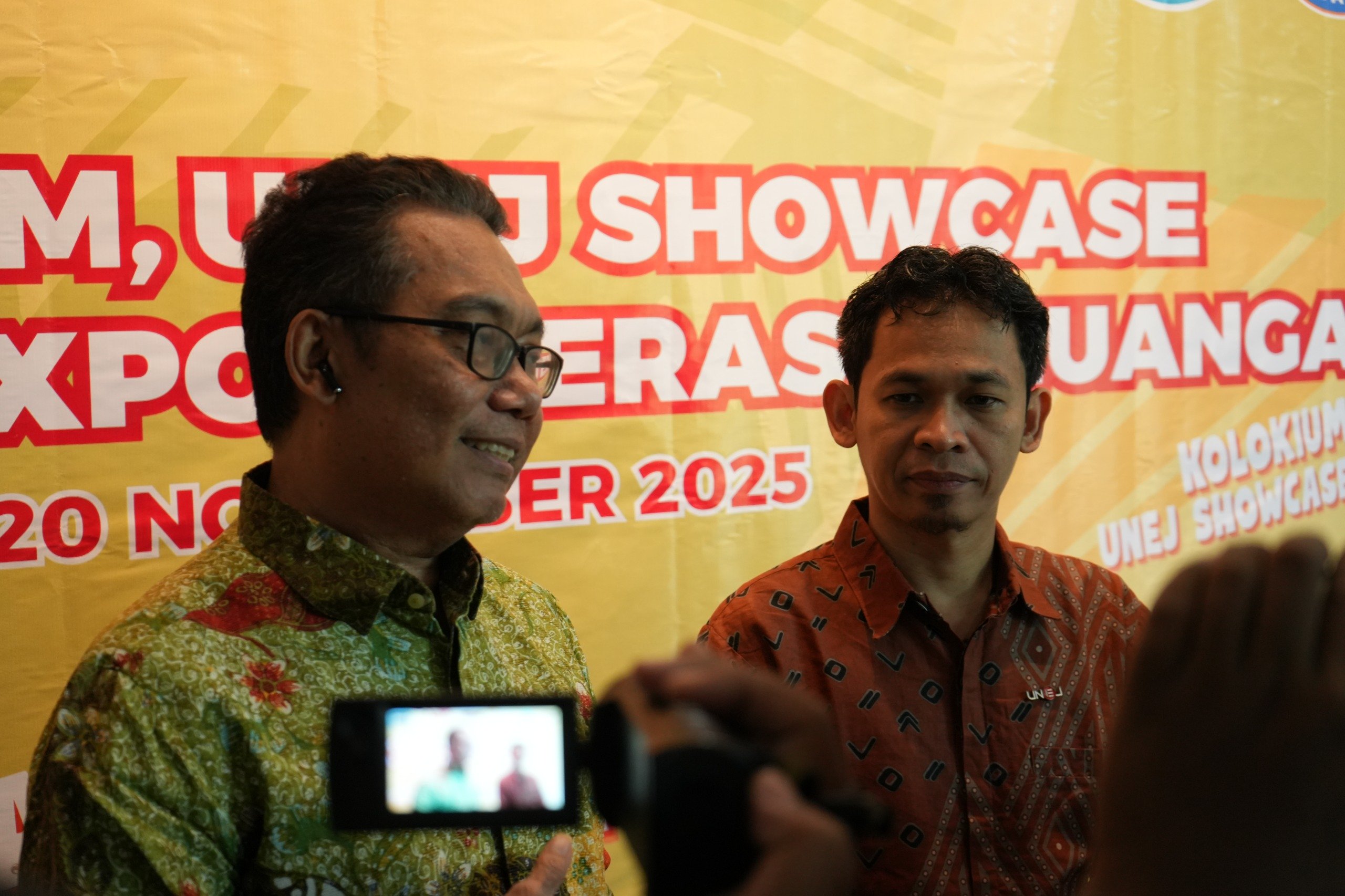 (dari kiri) Wakil Rektor Bidang Perencanaan, Kerja Sama, dan Sistem Informasi UNEJ, Prof. Bambang Kuswandi bersama Sekretaris 1 LPPM UNEJ, Bevo Wahono usai acara Talkshow Literasi Keuangan UNEJ, Rabu (19/11/2025)