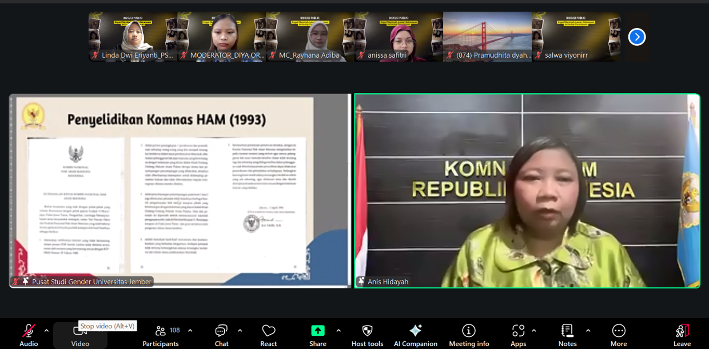 Tentang Marsinah, Anies Hidayah menjelaskan bahwa penyelidikan kasus pembunuhan Marsinah sejak 1998 telah menemukan indikasi kuat keterlibatan tiga anggota militer dan seorang sipil. Namun, proses hukum berulang kali terhambat hingga Sidang Paripurna 2000. Pembukaan kembali penyelidikan pada 2013 menguatkan komitmen Komnas HAM untuk menetapkan kasus ini sebagai pelanggaran HAM berat sehingga tetap dapat dibawa ke Pengadilan HAM meski pidana umumnya telah kadaluwarsa. Anies Hidayah menegaskan bahwa negara memiliki tanggung jawab penuh untuk menghapus segala bentuk kekerasan terhadap perempuan.