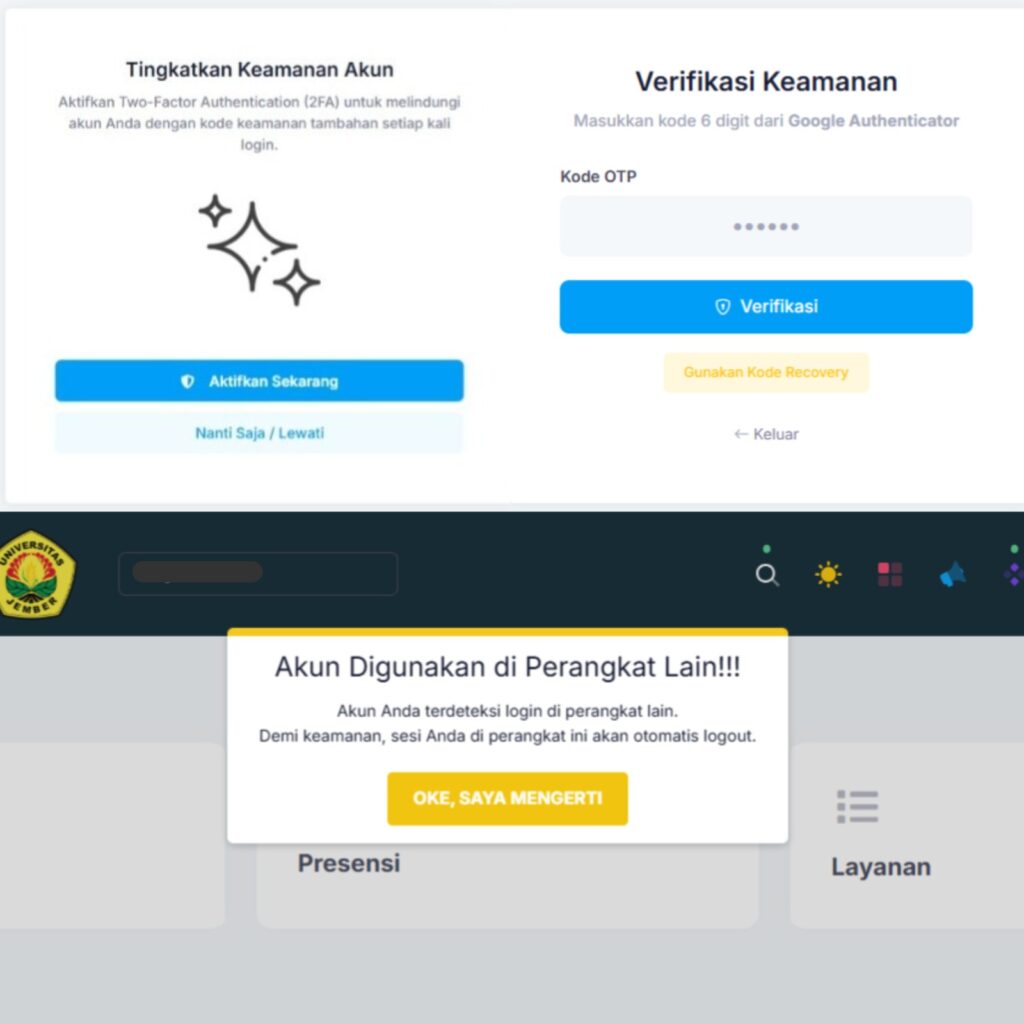 Seiring dengan pemanfaatan satu akun SSO UNEJ untuk mengakses berbagai layanan digital kampus, keamanan akun menjadi aspek krusial. Oleh karena itu, UPA TIK UNEJ menerapkan Two-Factor Authentication (2FA) sebagai perlindungan berlapis bagi sivitas akademika. Kepala UPA TIK UNEJ, Prof. Bayu Taruna Widjaja Putra, S.TP., M.Eng., Ph.D., menjelaskan bahwa penerapan 2FA bertujuan memberikan perlindungan ekstra terhadap data akademik dan personal sivitas akademika. Kebijakan ini juga menjadi bagian dari UPA TIK dalam membangun kesadaran (awareness) keamanan informasi di lingkungan kampus.