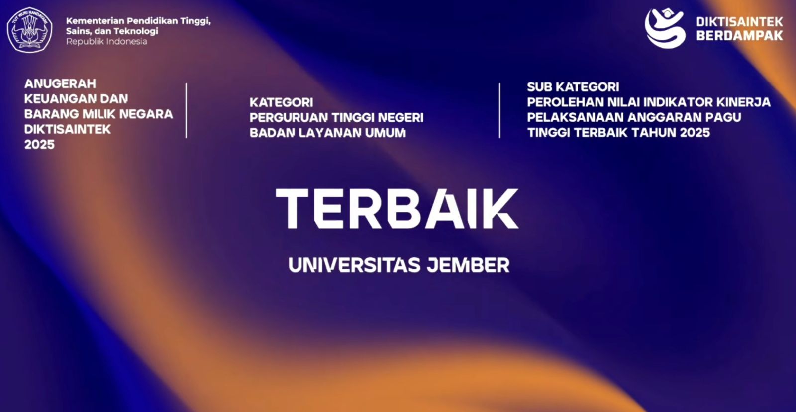 Dalam ajang bergengsi Anugerah Diktisaintek Tahun 2025 yang diselenggarakan oleh Direktorat Jenderal Pendidikan Tinggi, Riset, dan Teknologi (Ditjen Diktiristek) Kemendikbudristek di Jakarta, Kamis (19/12), Universitas Jember berhasil memboyong sejumlah penghargaan bergengsi pada kategori Keuangan dan Barang Milik Negara (BMN), Perencanaan, Kerja Sama, serta Kehumasan.”Capaian ini semakin mengukuhkan posisi Universitas Jember sebagai perguruan tinggi yang tidak hanya unggul dalam bidang akademik, tetapi juga progresif dalam tata kelola dan kinerja institusi. Pada Anugerah Diktisaintek 2025 Kategori PTN BLU, UNEJ berhasil meraih Terbaik I Anugerah Keuangan dan Barang Milik Negara β Sub Kategori Pelaksanaan Tindak Lanjut Hasil Pemeriksaan BPK Terbaik, Bronze Winner Anugerah Perancanaan – Sub Kategori Penyelenggaraan SAKIP Terbaik, Bronze Winner dan Silver Winner Anugerah Kerja Sama β Sub Kategori Kerja Sama Industri Terbaik dan Kerja Sama Pemerintah/Lembaga Swadaya Masyarakat Terbaik, serta Bronze Winner Anugerah Humas – Sub Kategori Siaran Pers