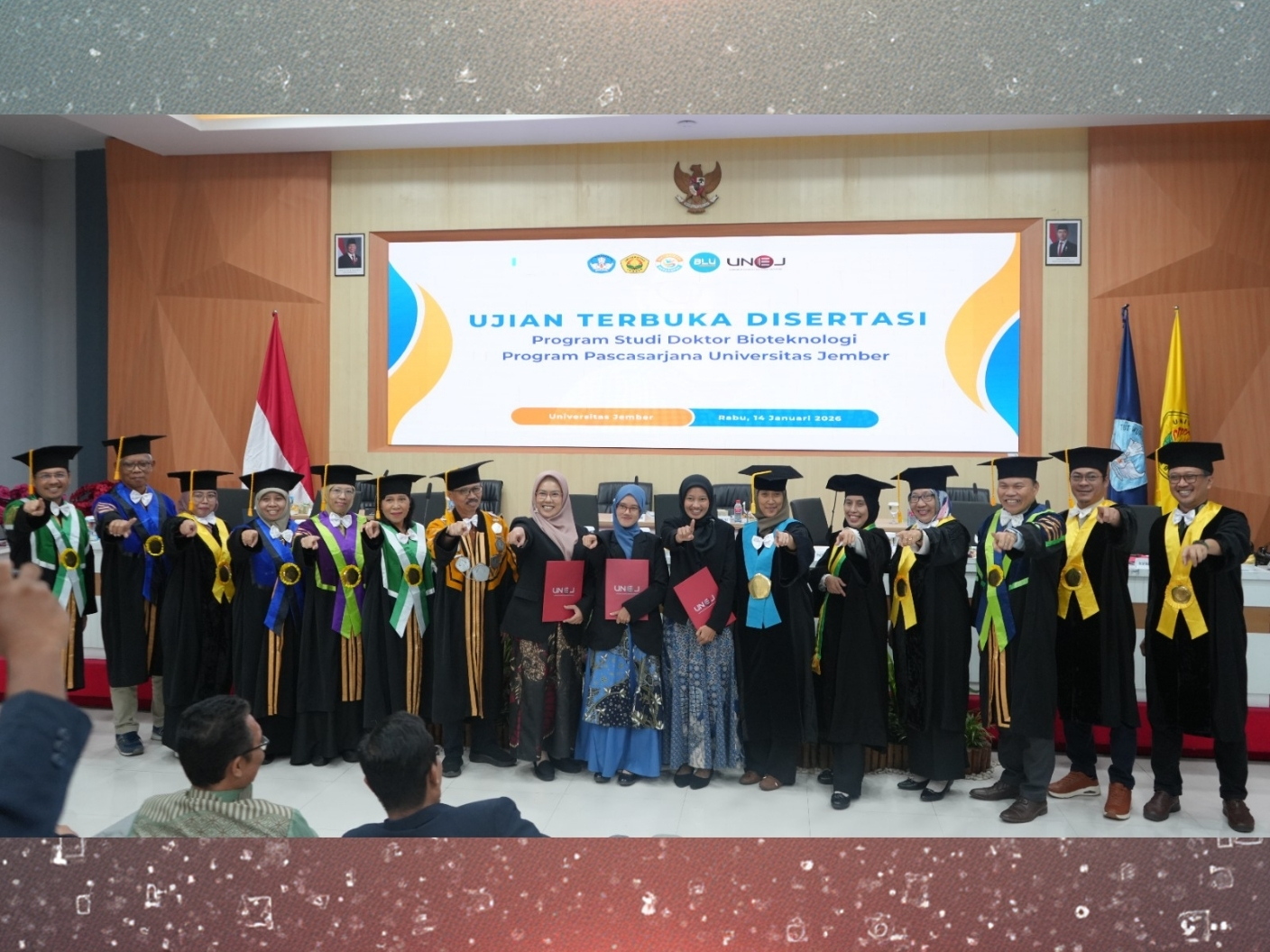 Jember, 14 Januari 2026 Universitas Jember (UNEJ) mencatat sejarah akademik dengan menyelenggarakan Ujian Terbuka Disertasi Program Doktor (S3) Bioteknologi untuk pertama kalinya, Rabu (14/1), di Ruang Auditorium Lantai III Gedung Kewirausahaan Universitas Jember. Tiga promovendus, yakni Intan Ria Neliana, S.Pd., M.Biotek., Riska Ayu Febrianti, S.Pd., M.Biotek., dan apt. Endah Puspitasari, S.Farm., M.Sc., dinyatakan lulus ujian...Read More