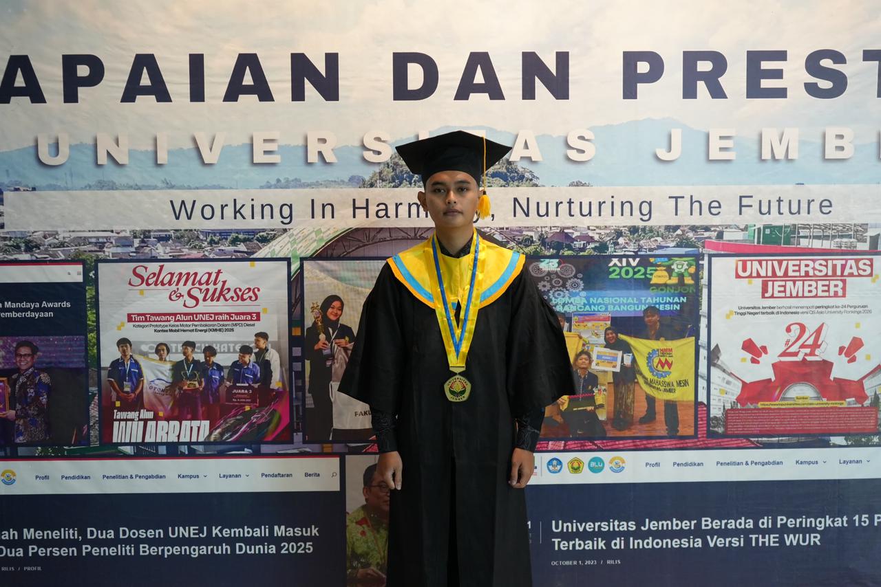 Para wisudawan lulusan program doktor, magister, sarjana, dan diploma secara resmi menyandang gelar akademiknya setelah lulus dari Universitas Jember.Di tengah kebahagiaan para wisudawan yang resmi dikukuhkan, terdapat kisah inspiratif pada wisuda periode ini datang dari Teguh Efendi, lulusan Fakultas Teknologi Pertanian (FTP) yang meraih IPK 3,71 dengan masa studi 3 tahun 11 bulan 7 hari. Di tengah kesibukan kuliahnya, Teguh berhasil membuktikan bahwa mahasiswa bisa memiliki kompetensi lintas disiplin dengan meraih sertifikasi kompetensi dari Badan Nasional Sertifikasi Profesi (BNSP) sebagai Junior Data Scientist.