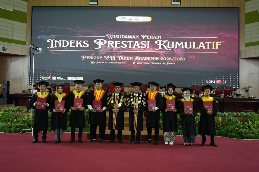 Universitas Jember (UNEJ) menggelar upacara wisuda periode VII tahun akademik 2025/2026 di gedung Auditorium kampus Tegalboto (24/1/2026).