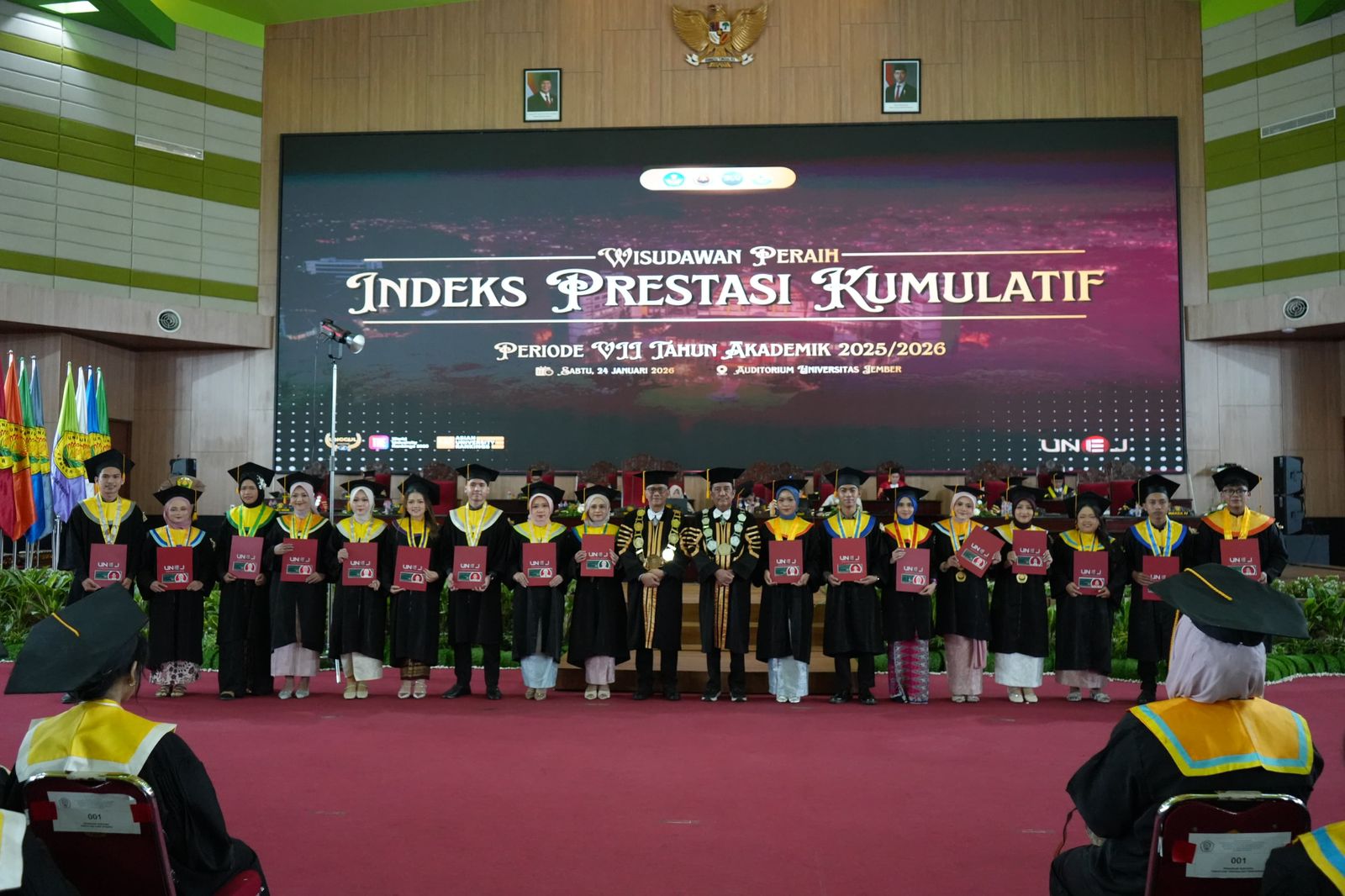 Universitas Jember (UNEJ) menggelar upacara wisuda periode VII tahun akademik 2025/2026 di gedung Auditorium kampus Tegalboto (24/1/2026).