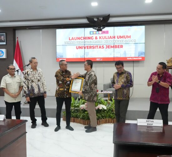 Jember, 5 Februari 2026 Ketua Badan Nasional Sertifikasi Profesi (BNSP), Syamsi Hari menyerahkan sertifikat lisensi Lembaga Sertifikasi Profesi Pihak Pertama (LSP-P1) kepada...